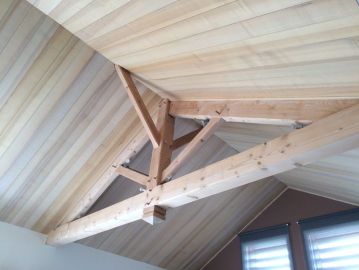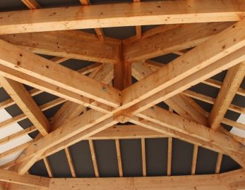Nos charpentes sont taillées en atelier avec des assemblages traditionnels avant d'être levées sur les chantiers.